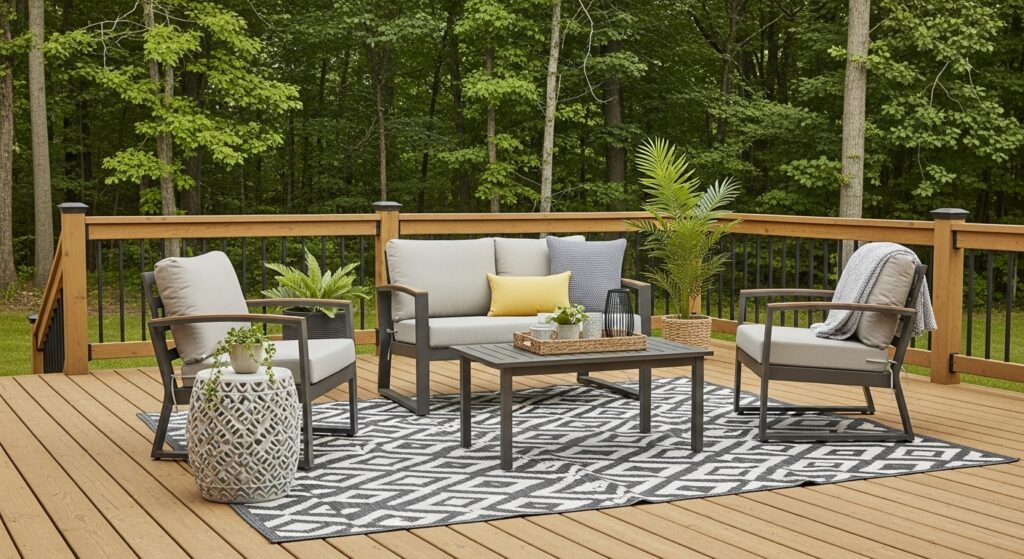 Para começar, vamos falar sobre como criar a base perfeita. Nossa primeira grande ideia é definir seu espaço com um tapete externo elegante e durável . Pense nele como a âncora de toda a sua decoração. Ele instantaneamente harmoniza tudo, adicionando um toque de cor, textura e uma sensação aconchegante de integração entre os ambientes internos e externos. Os tapetes externos modernos são incríveis: resistentes às intempéries, fáceis de limpar e disponíveis em inúmeros designs, desde estampas geométricas ousadas até tons naturais sutis. Colocar um tapete sob sua área de estar não só protege seu deck ou pátio, como também delimita claramente sua “sala de estar” ao ar livre . É uma mudança simples que causa um grande impacto visual, tornando o espaço mais intencional, confortável e convidativo. Acredite, esta é uma das maneiras mais rápidas de transformar seu quintal de sem graça para fabuloso.