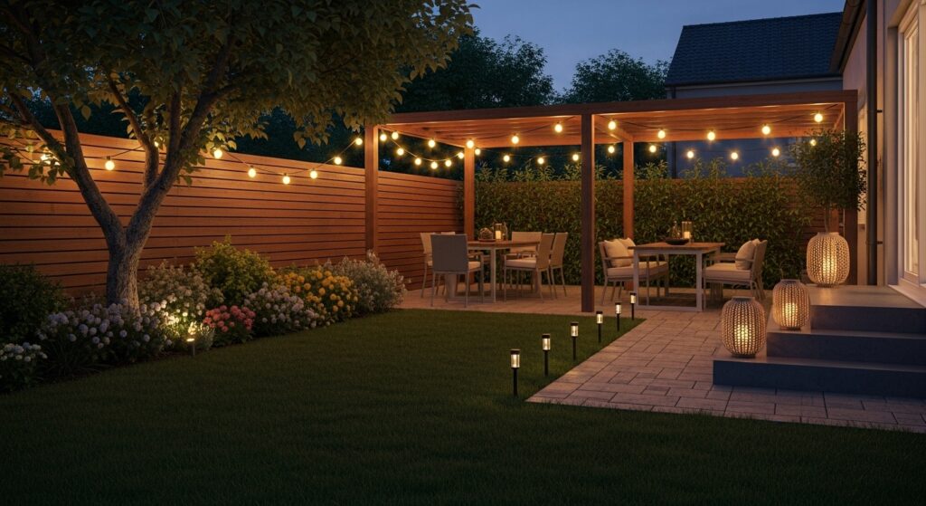 Muito bem, vamos à terceira ideia, e esta é revolucionária para as noites de verão: iluminação ambiente . A iluminação certa pode transformar completamente o ambiente do seu espaço, transformando um simples quintal em um refúgio mágico após o pôr do sol. Luzes de cordão são um clássico por um bom motivo: são acessíveis, fáceis de instalar e emitem um brilho quente e festivo que é instantaneamente encantador. Pendure-as sobre sua pérgola, ao longo de uma cerca ou entre os galhos de uma árvore. Mas não pare por aí! Considere luzes de caminho movidas a energia solar para iluminar as calçadas ou coloque algumas lanternas externas estilosas em mesas ou degraus para um toque mais sofisticado. Criar camadas de luz em diferentes alturas adiciona profundidade e interesse, tornando seu jardim encantador e agradável mesmo depois que escurece.